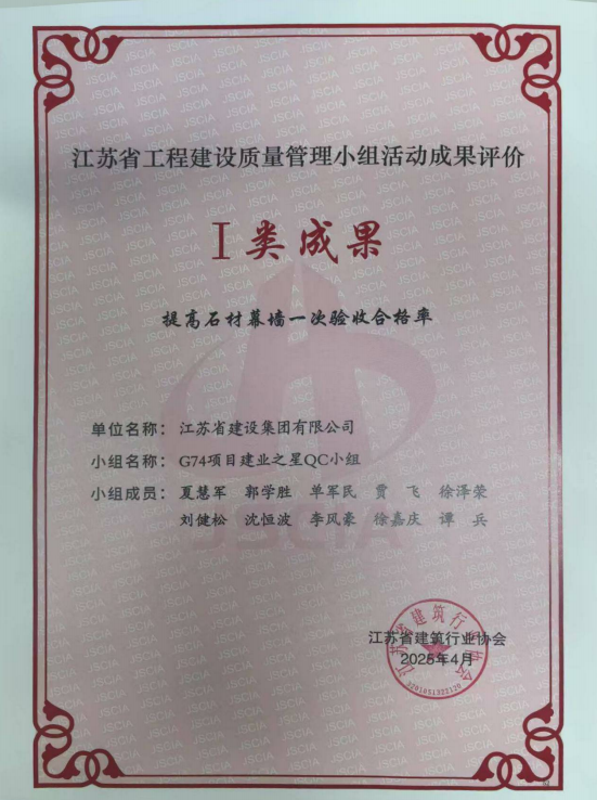 G74项目获得江苏省QC一类成果奖
